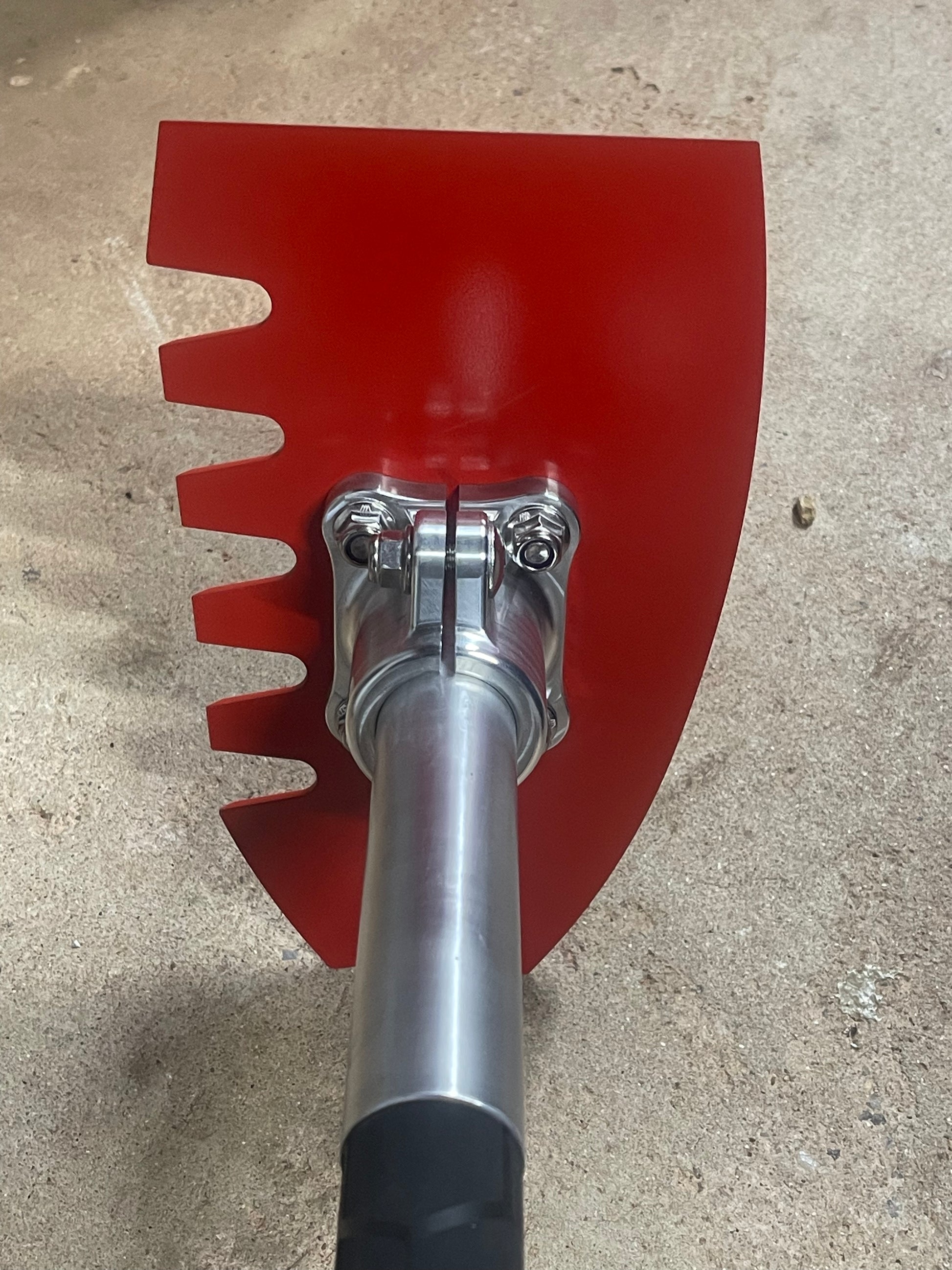 The 130cm pultruded fibreglass handle is 32mmm diameter and has a slight texture for added grip. The shock absorbing qualities of the handle is better than timber alternatives, yet it is still incredibly strong and durable. This is clamped into our large aluminium connector and bolted together using M8 stainless steel carriage bolts and nylock nuts for strength and easy servicing.